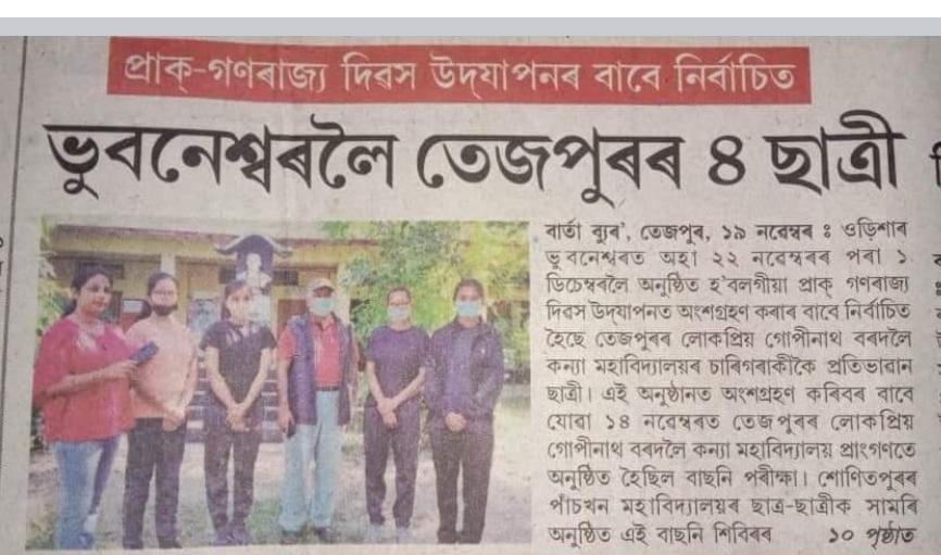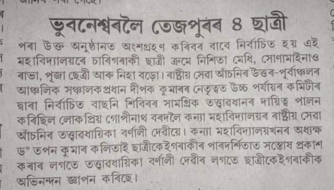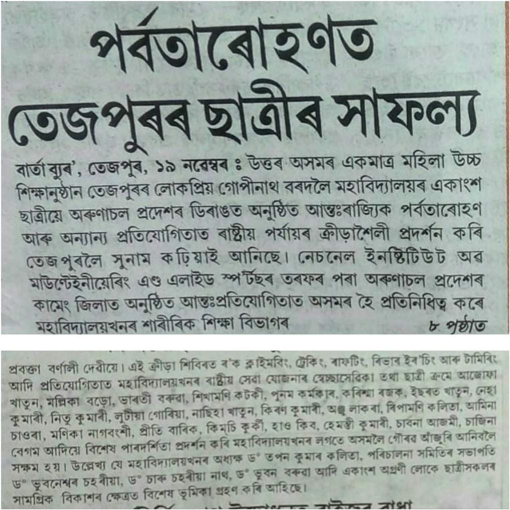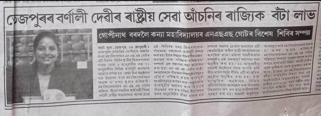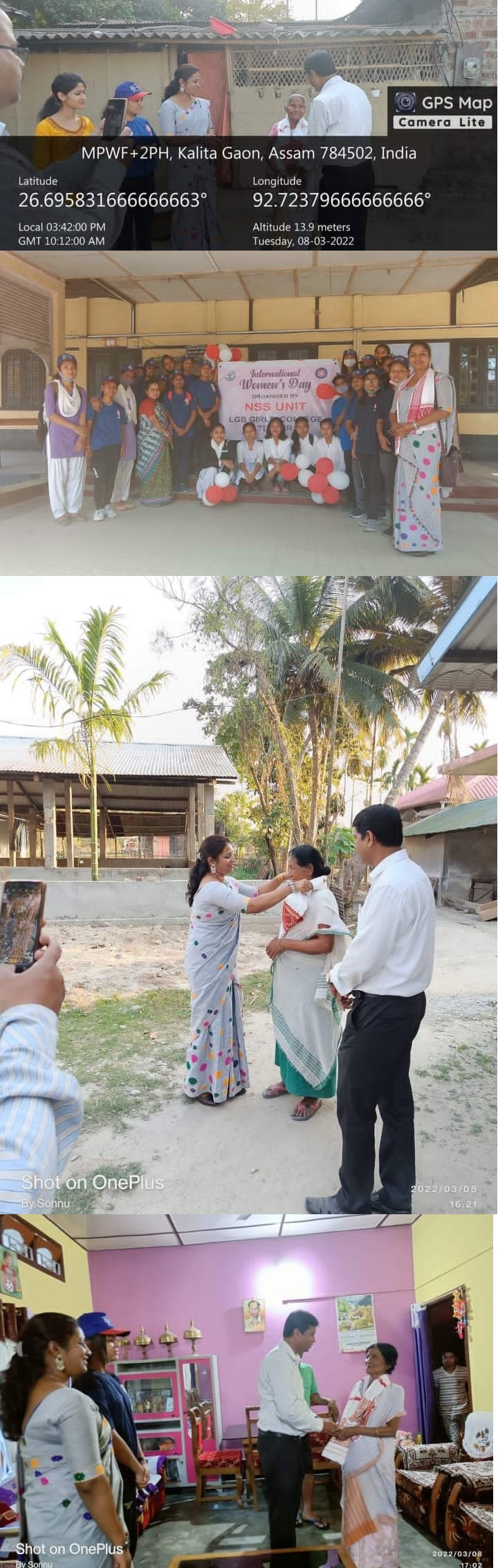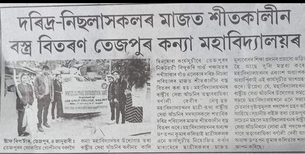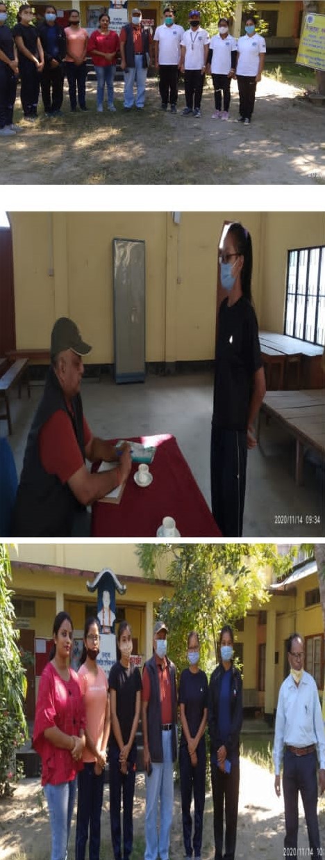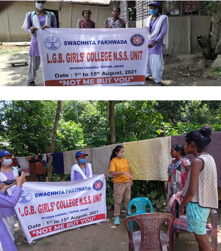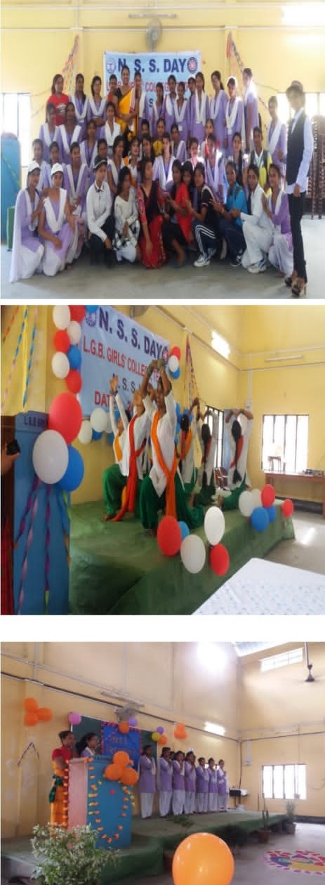 About National Service Scheme (NSS): L.G.B. Girls' College has a full fledged and active National Service Scheme Unit under the guidance of Programme Officer, Mrs Barnali Devi. Interested students can enroll themselves and render their service to the College as well as to the society. The NSS of our college has organized and attended several camping programmes, training courses and orientation programmes. The NSS unit of our college participated in the "Biswa Bharati University Mega Camp" held in Rajasthan from 05.09.2014 to 16.09.2014 and won the 'Best Management Award'. The NSS Unit of our college also won the Best Management Award, Best Discipline Award and Best Cultural Award in the "North East NSS Festival" held in NERIST University from 05.06.2015 to 13.06.2015, Itanagar. They also participated in the "Dirang Adventure Camp" and availed the national coaching programmes on Mountaineering, River Crossing, Rock Climbing, Trekking, Jumaring and Rappelling and received certificates. They were adjudged as the 'Disciplined Team' in the "Youth Exchange and Home Stay Programme" organized in Goa from 08.12.2015 to 28.12.2015. They received the Best Cultural Programme award in "The North East NSS Festival" held in Aizwal, Mizoram from 17.09.2016 to 24.09.2016. The NSS Unit of our college also successfully participated and completed the Adventure International Coaching Camp and Special Camp organized in different places in the year 2014, 2015 and 2016.
