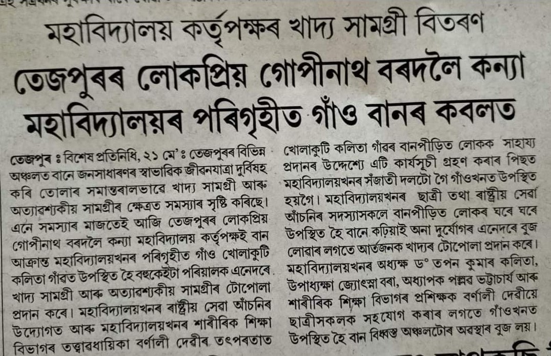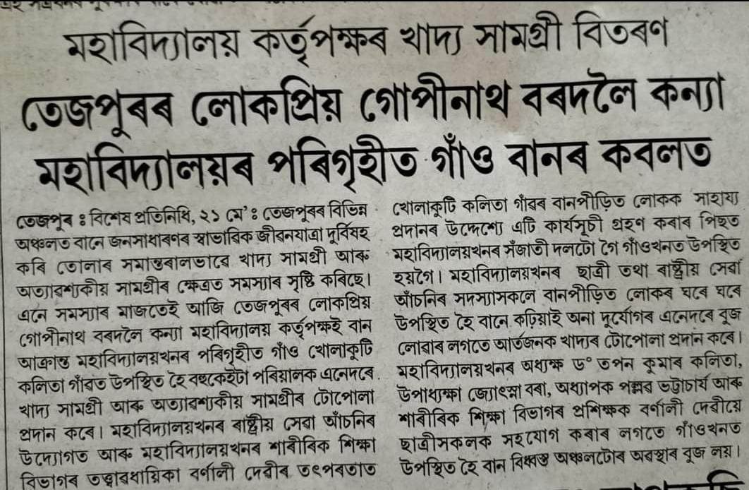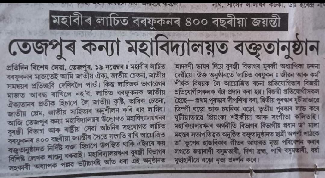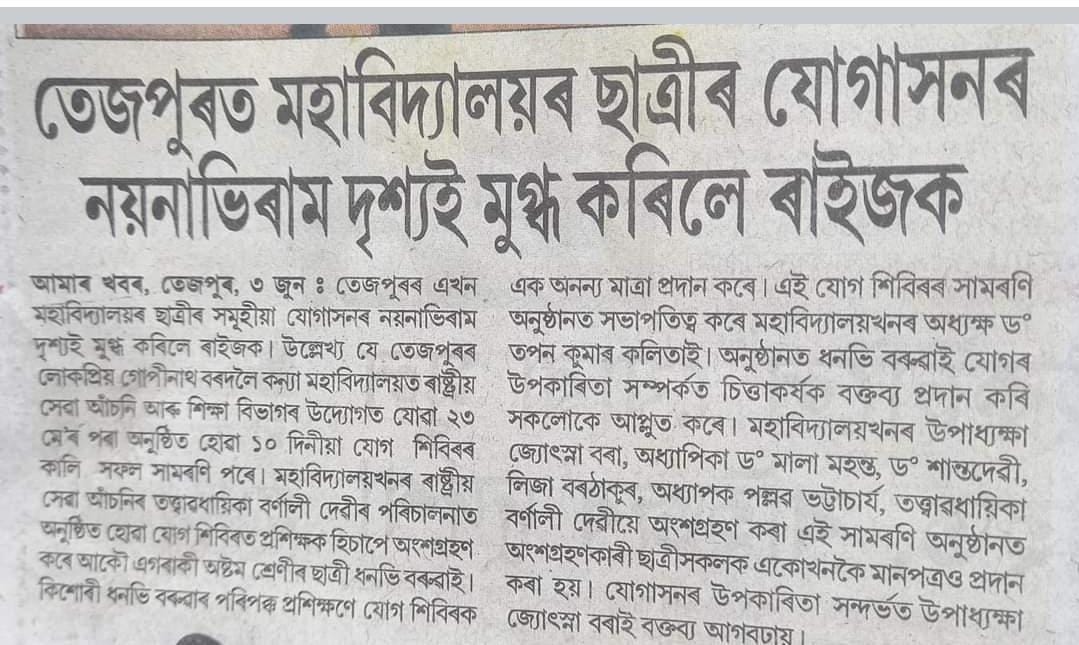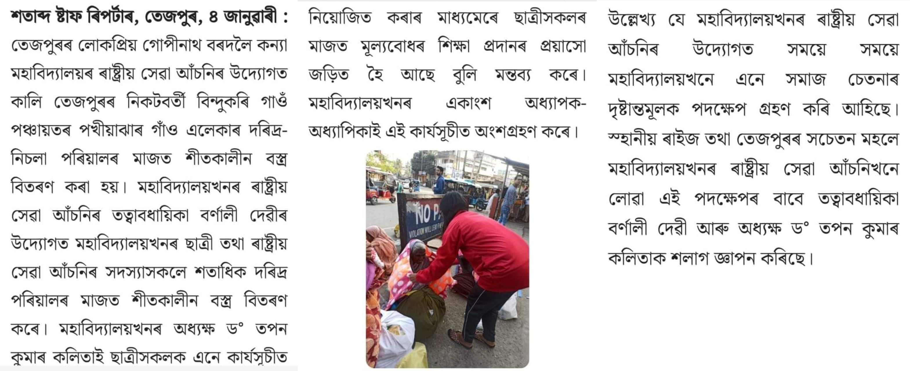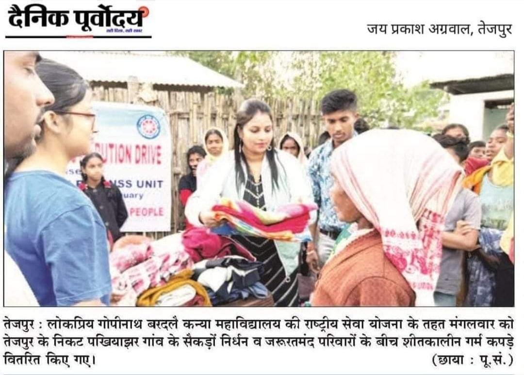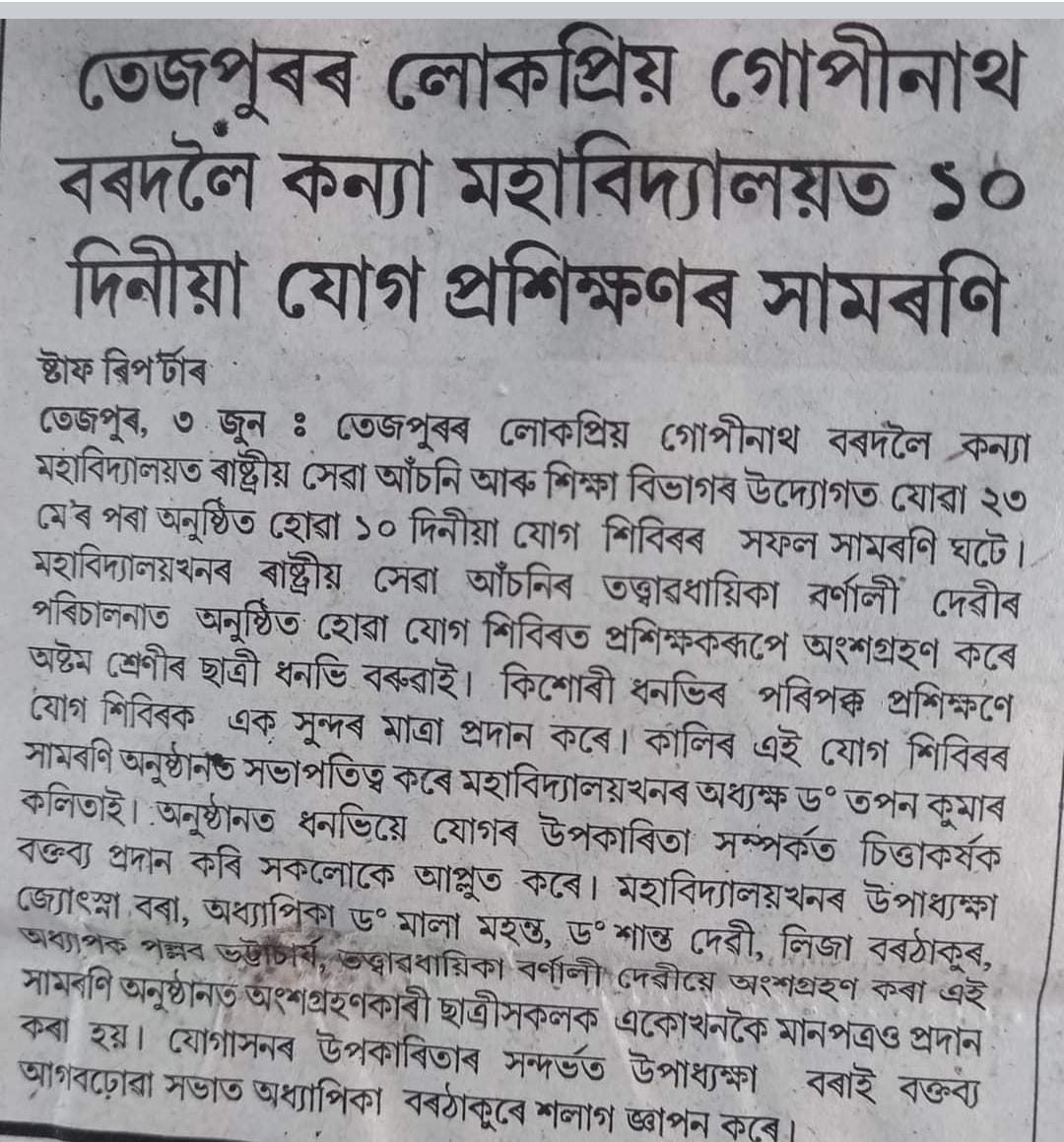 About National Service Scheme (NSS): L.G.B. Girls' College has a full fledged and active National Service Scheme Unit under the guidance of Programme Officer, Mrs Barnali Devi. Interested students can enroll themselves and render their service to the College as well as to the society. The NSS of our college has organized and attended several camping programmes, training courses and orientation programmes. The NSS unit of our college participated in the "Biswa Bharati University Mega Camp" held in Rajasthan from 05.09.2014 to 16.09.2014 and won the 'Best Management Award'. The NSS Unit of our college also won the Best Management Award, Best Discipline Award and Best Cultural Award in the "North East NSS Festival" held in NERIST University from 05.06.2015 to 13.06.2015, Itanagar. They also participated in the "Dirang Adventure Camp" and availed the national coaching programmes on Mountaineering, River Crossing, Rock Climbing, Trekking, Jumaring and Rappelling and received certificates. They were adjudged as the 'Disciplined Team' in the "Youth Exchange and Home Stay Programme" organized in Goa from 08.12.2015 to 28.12.2015. They received the Best Cultural Programme award in "The North East NSS Festival" held in Aizwal, Mizoram from 17.09.2016 to 24.09.2016. The NSS Unit of our college also successfully participated and completed the Adventure International Coaching Camp and Special Camp organized in different places in the year 2014, 2015 and 2016.